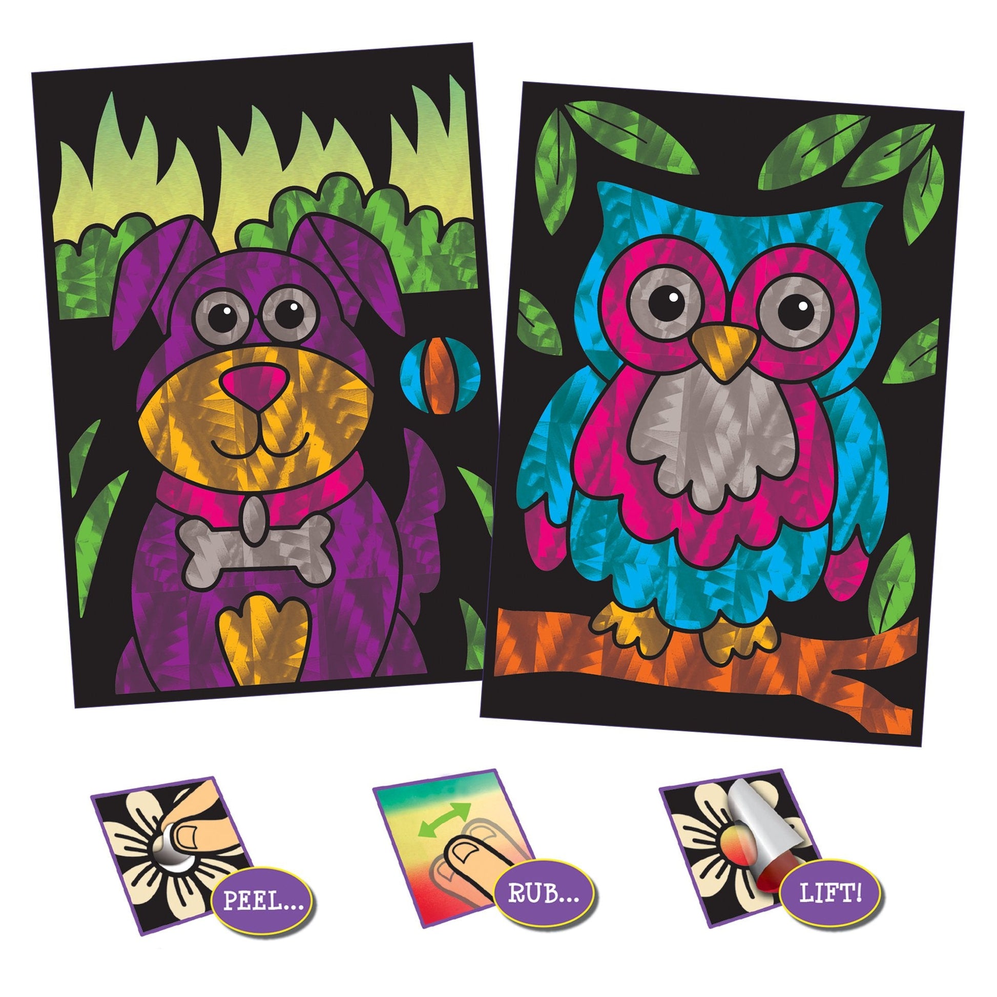Create 8 sparkly pictures with this foil art kit. Simply peel off a section from the picture, place the foil over the sticky area and rub with your finger. Lift up the foil sheet and the sparkly foil transfers to the picture.
