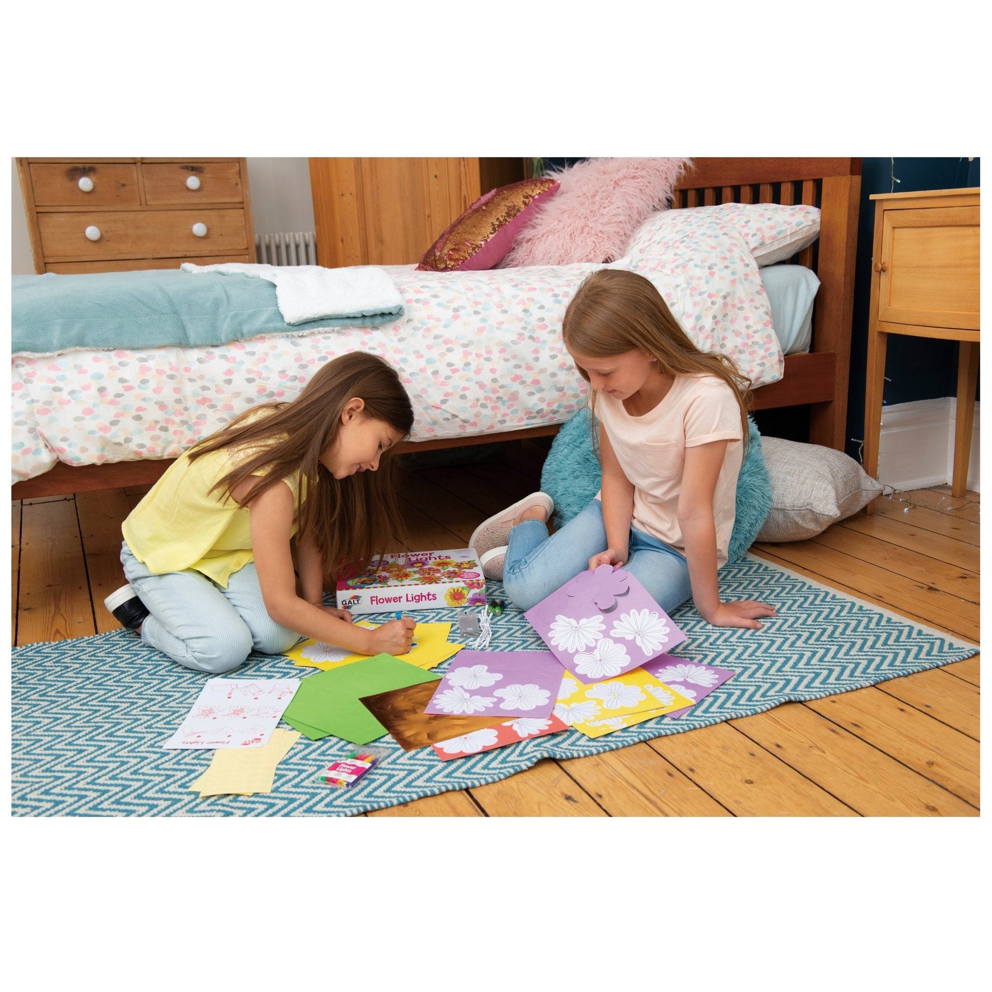 Make an amazing string of 10 flower lights to decorate your room. Customise your look by colouring in the patterned flowers, then layer up with coloured and metallic petals around each LED light to create a dazzling display. Contents: Assorted sheets of pre-cut paper flowers, 2 x AA batteries, 6 mini fibre pens, sticky circles and guide.