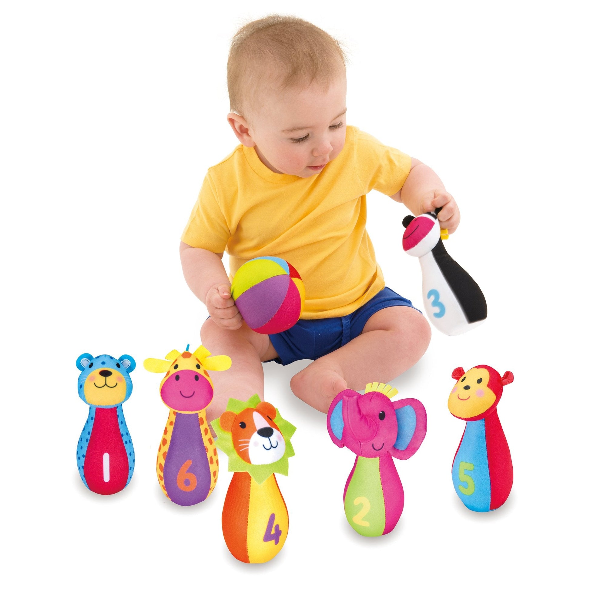 A fun bowling game for young children. The skittles each contain a rattle and the ball has a jingle bell. Soft, safe and machine washable. Packed in a PVC bag with carry handle.