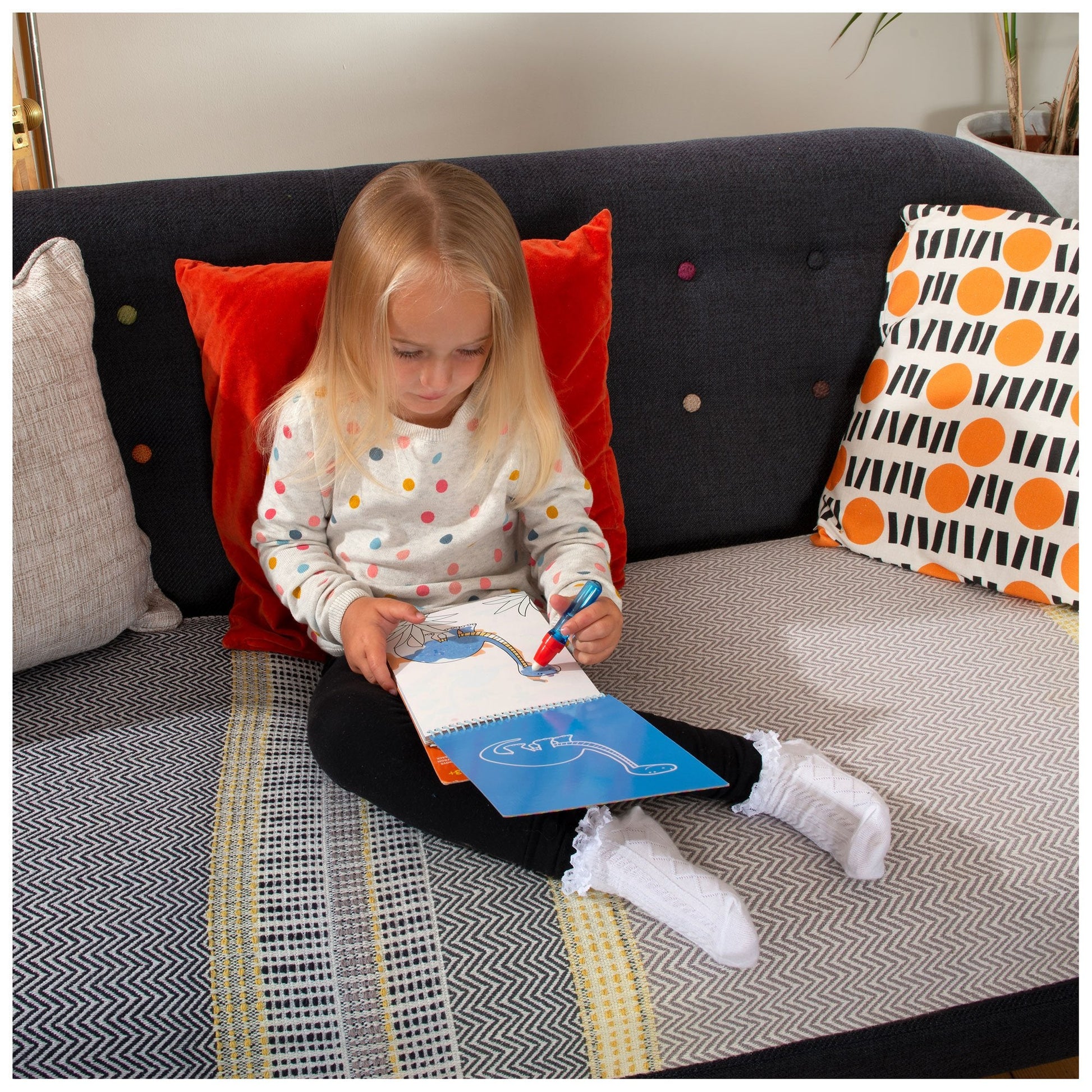6 reusable pictures on thick board to colour with the water pen. Fill the pen with water and use to reveal the hidden pictures.